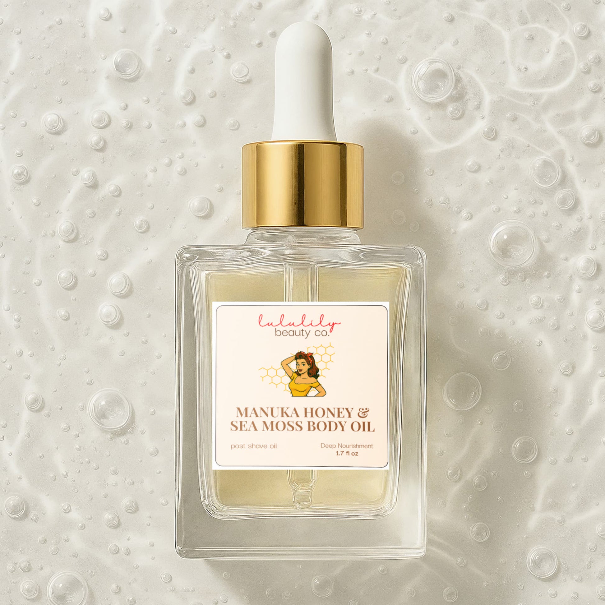 Discover a natural oil blend that soothes and hydrates while combating ingrown hairs. Infused with Manuka Honey Oil, Lime Essential Oil, and Sea Moss Extract, this lightweight oil restores moisture balance and nourishes skin for a smoother, healthier look.